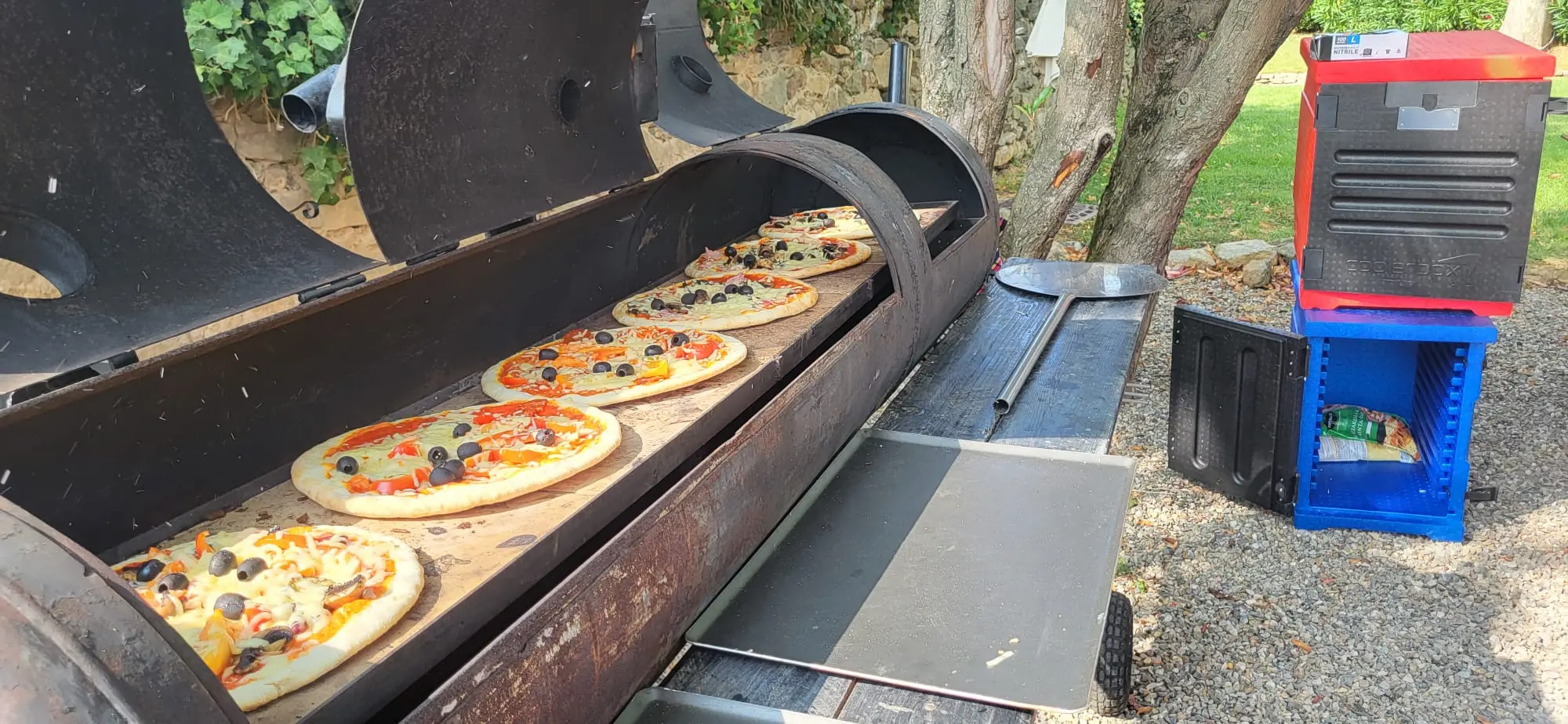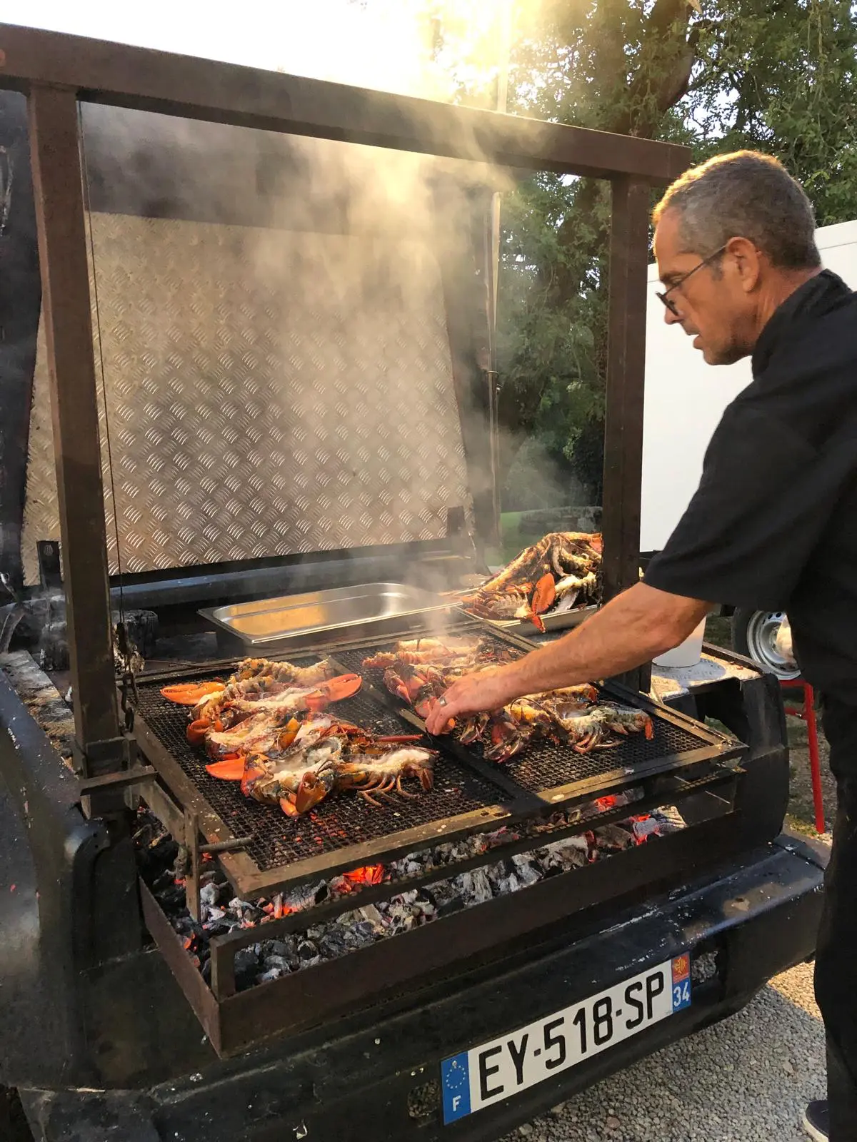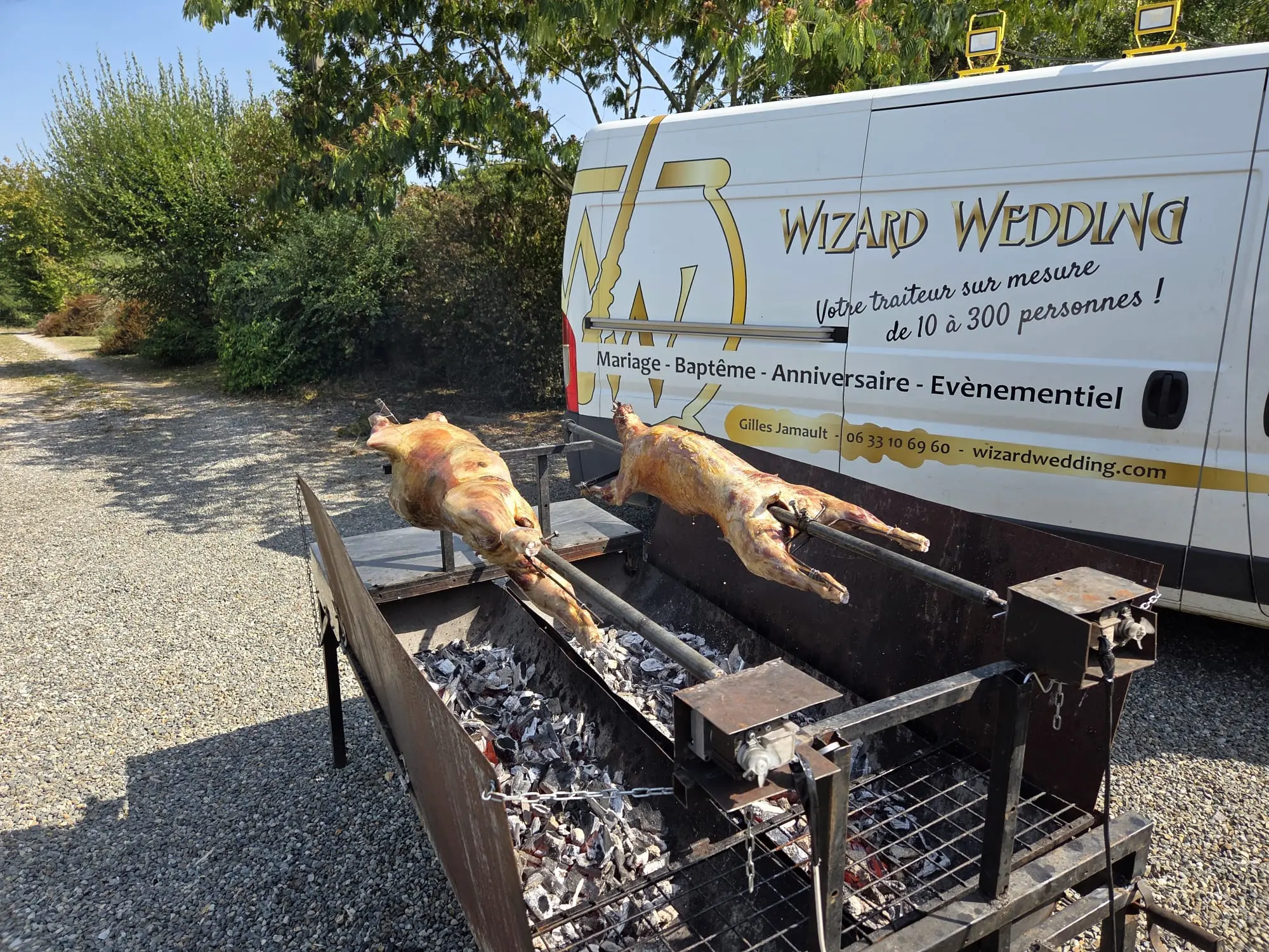 Cuit sur place (4 à 5 heures), servi avec une poêlée de pommes de terre et de légumes de saison.